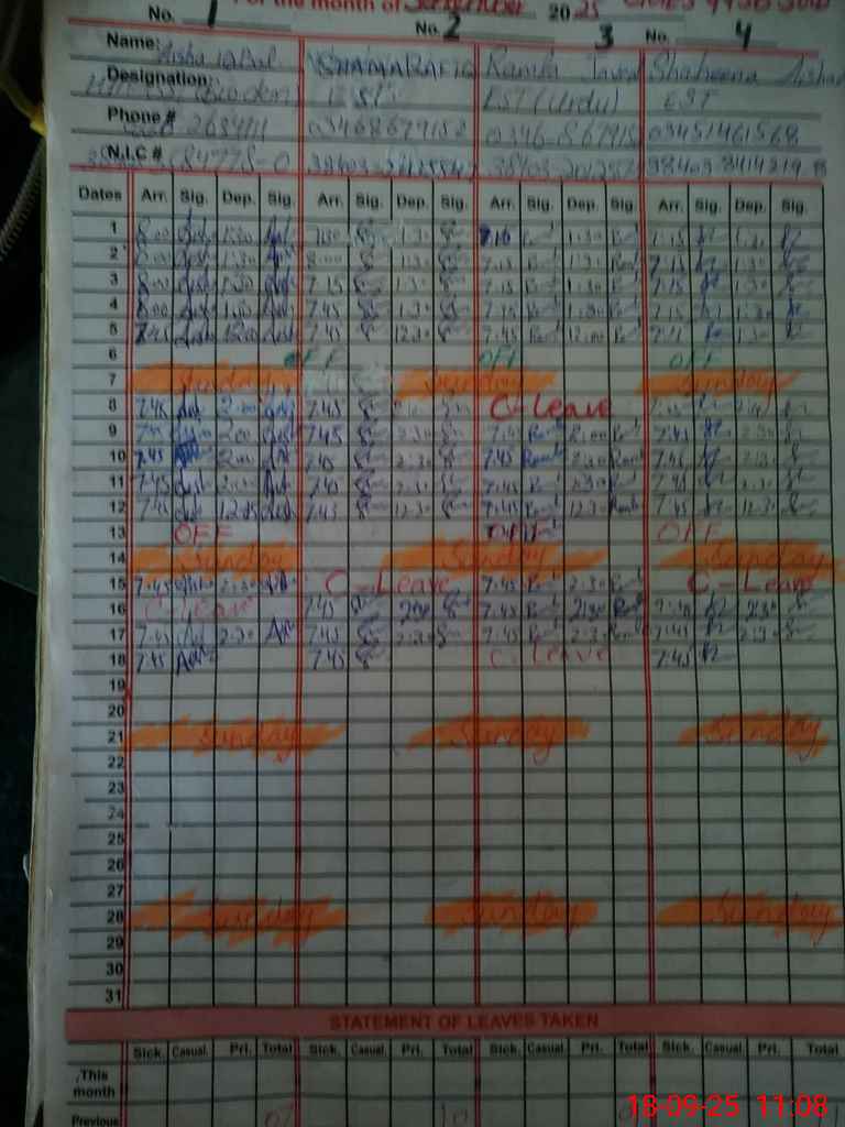 | CNIC | Full Name | Designation | R/C | Absence During Last Calender Month |