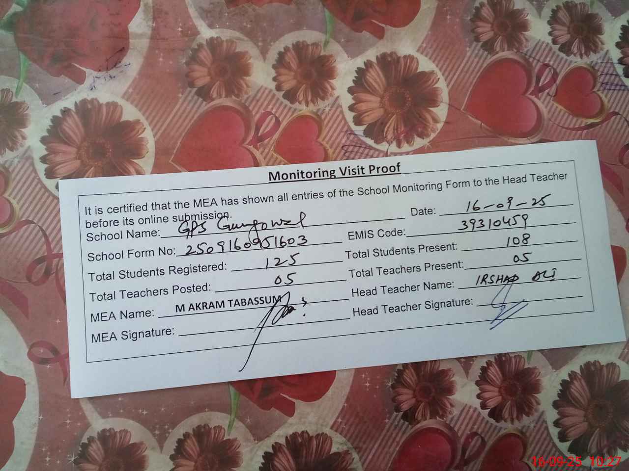 | Attendance Register | Head Teacher | MEA with School | Visit Proof |