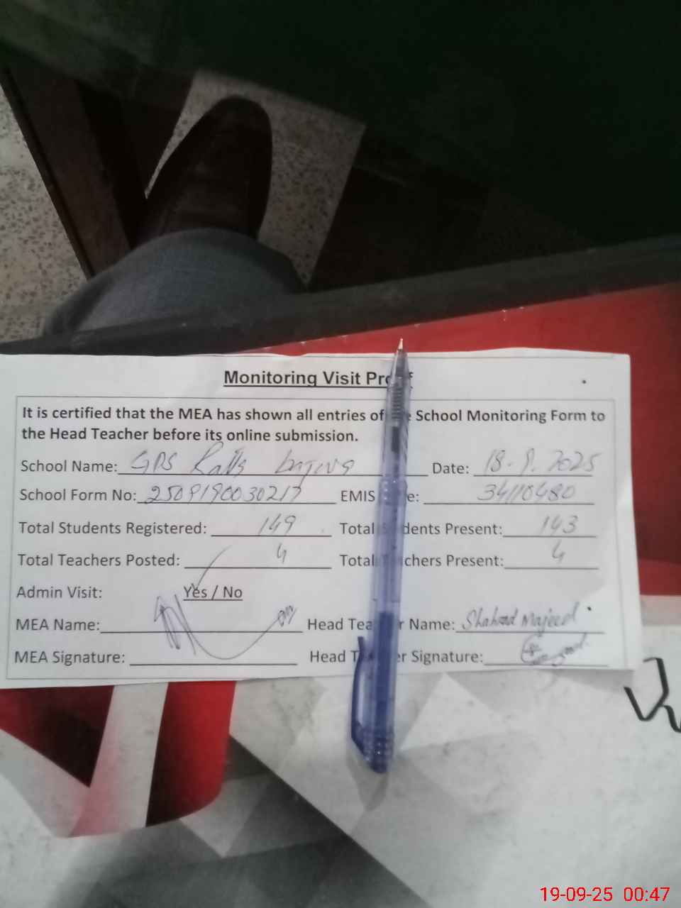 | Attendance Register | Head Teacher | MEA with School | Visit Proof |