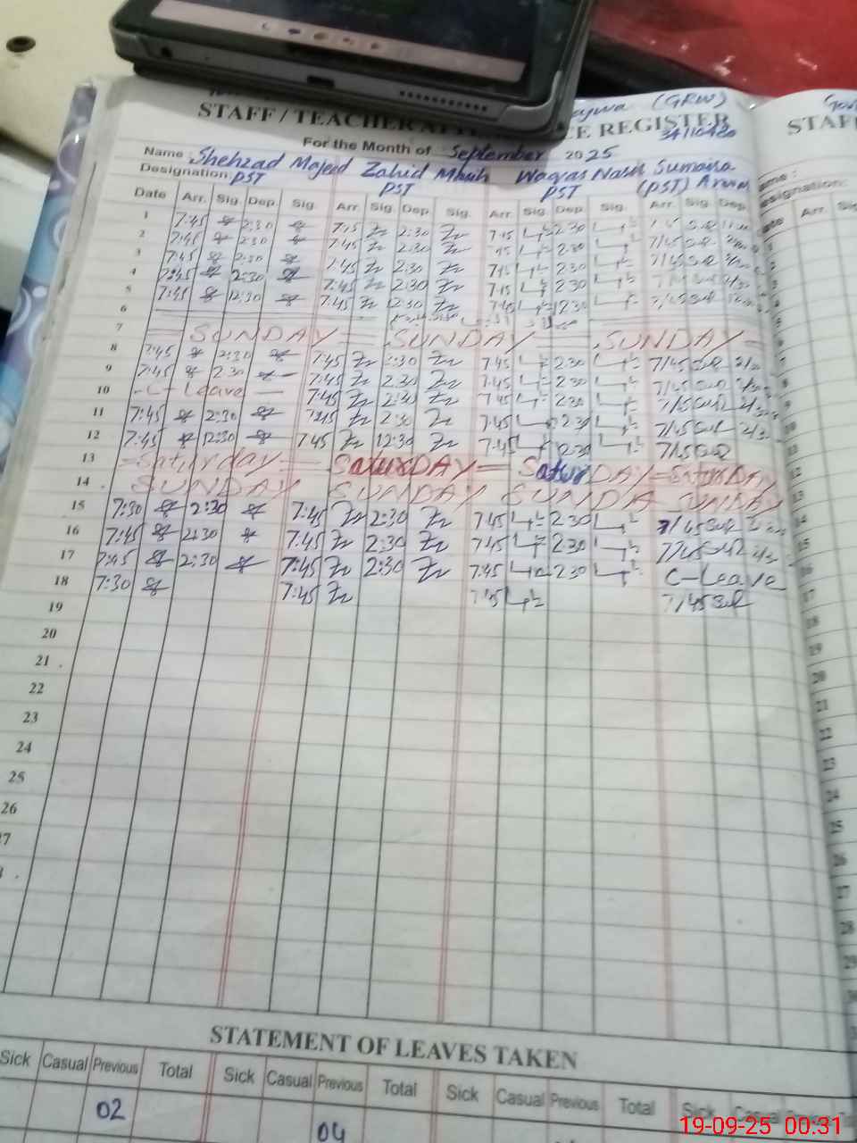 | CNIC | Full Name | Designation | R/C | Absence During Last Calender Month |