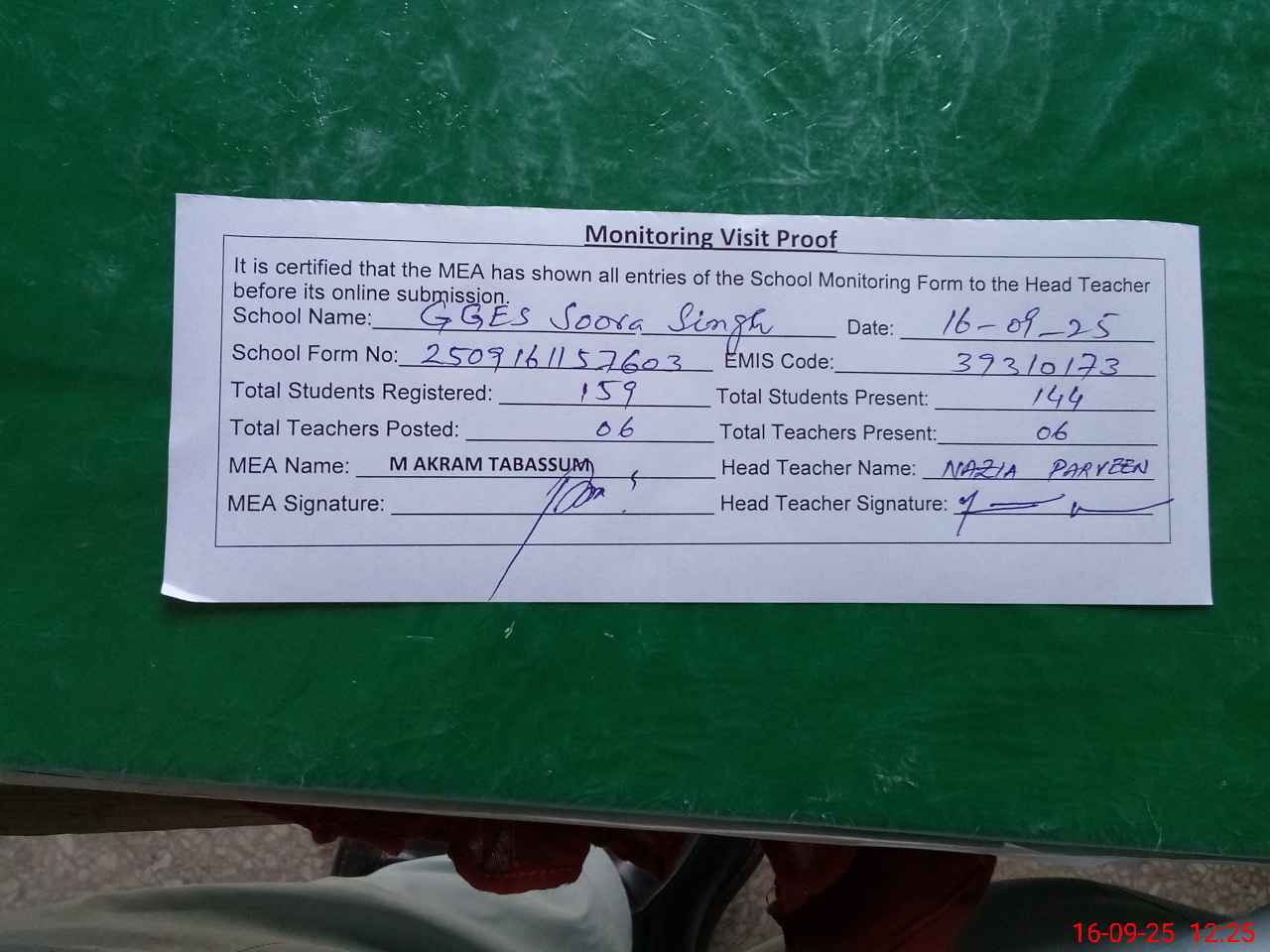 | Attendance Register | Head Teacher | MEA with School | Visit Proof |
