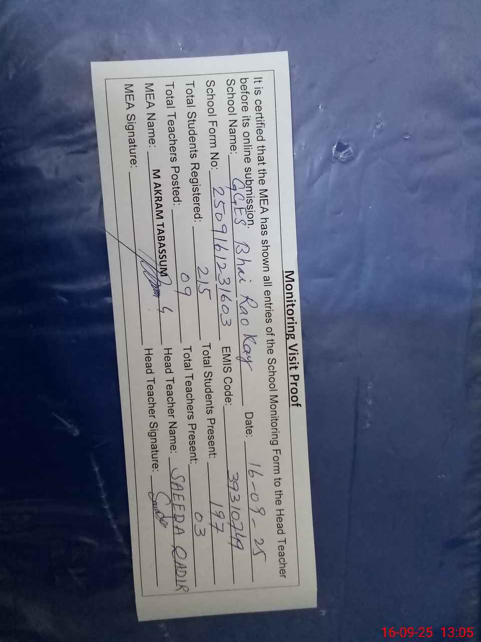 | Attendance Register | Head Teacher | MEA with School | Visit Proof |