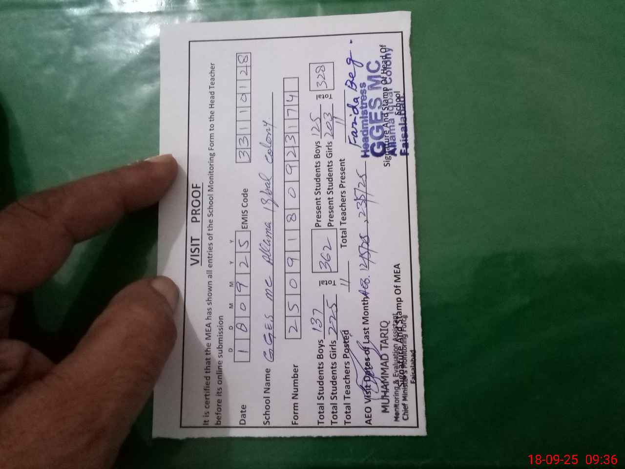 | Attendance Register | Head Teacher | MEA with School | Visit Proof |