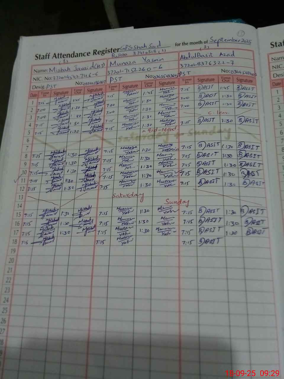 | CNIC | Full Name | Designation | R/C | Absence During Last Calender Month |