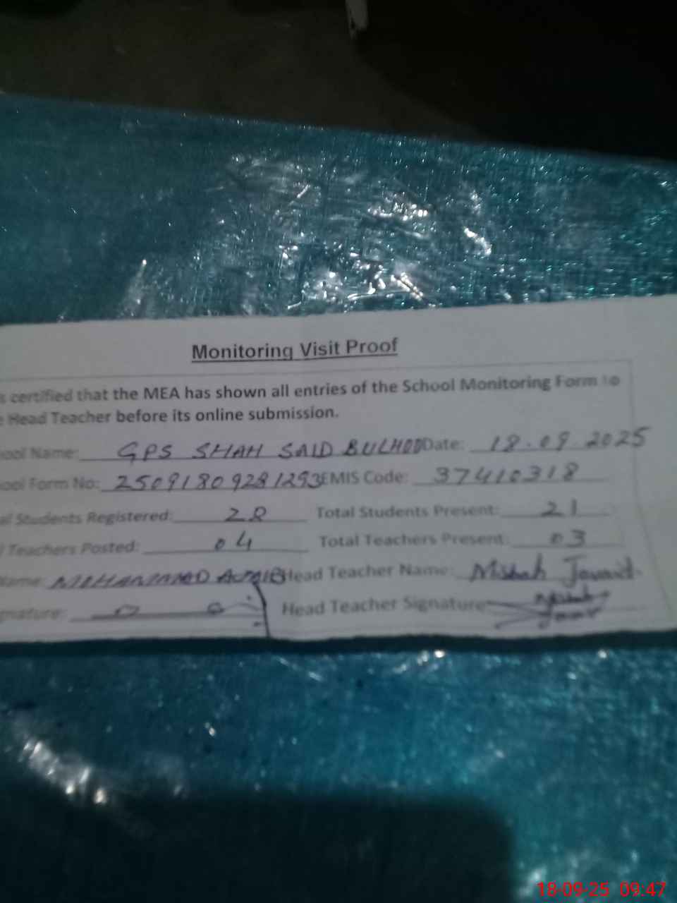 | Attendance Register | Head Teacher | MEA with School | Visit Proof |