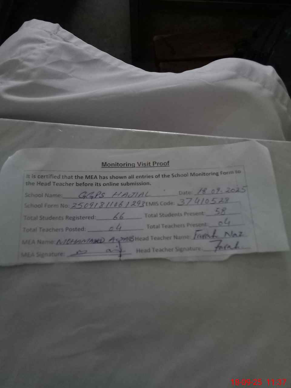 | Attendance Register | Head Teacher | MEA with School | Visit Proof |