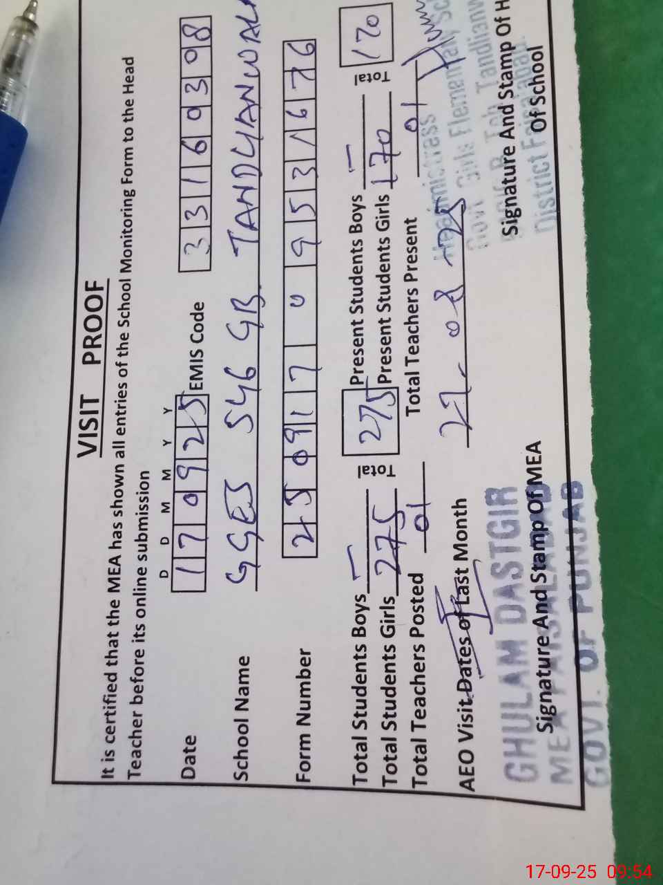 | Attendance Register | Head Teacher | MEA with School | Visit Proof |