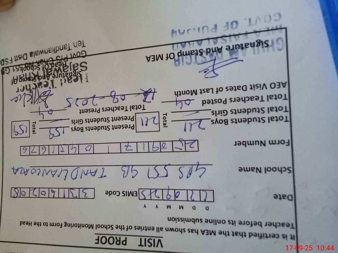 | Attendance Register | Head Teacher | MEA with School | Visit Proof |