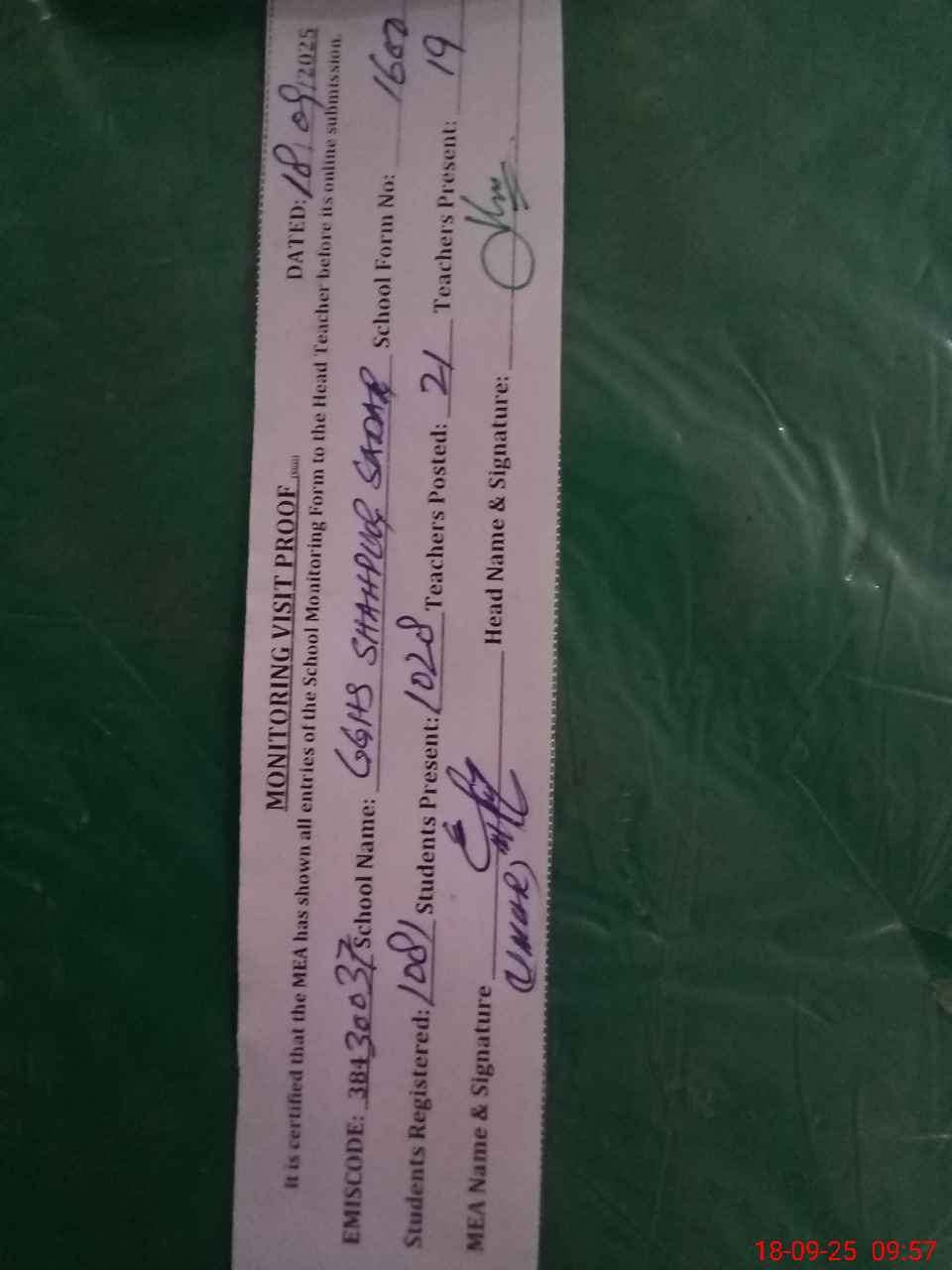| Attendance Register | Head Teacher | MEA with School | Visit Proof |