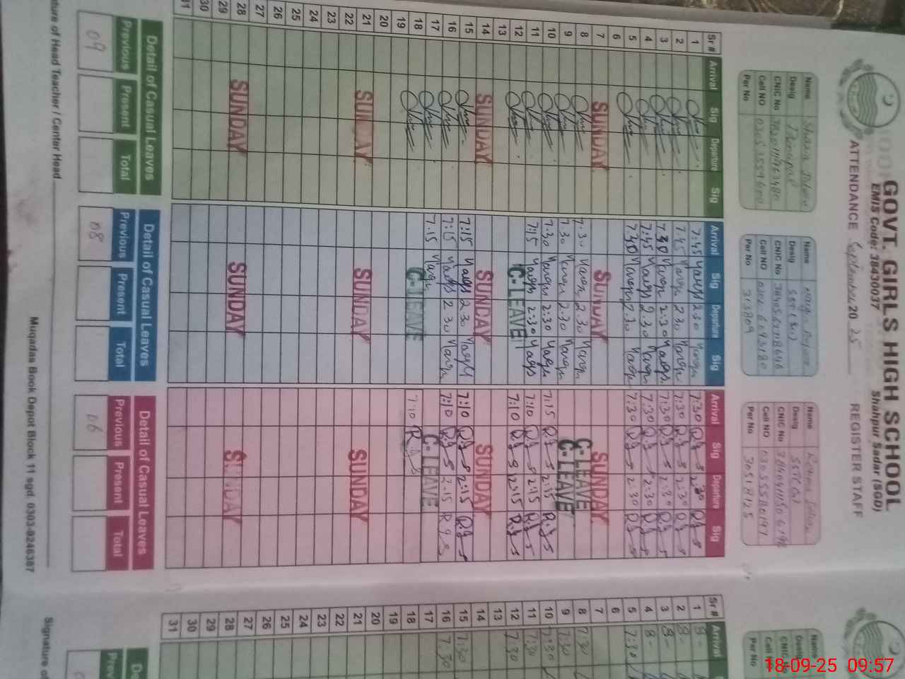 | CNIC | Full Name | Designation | R/C | Absence during last cal. month |