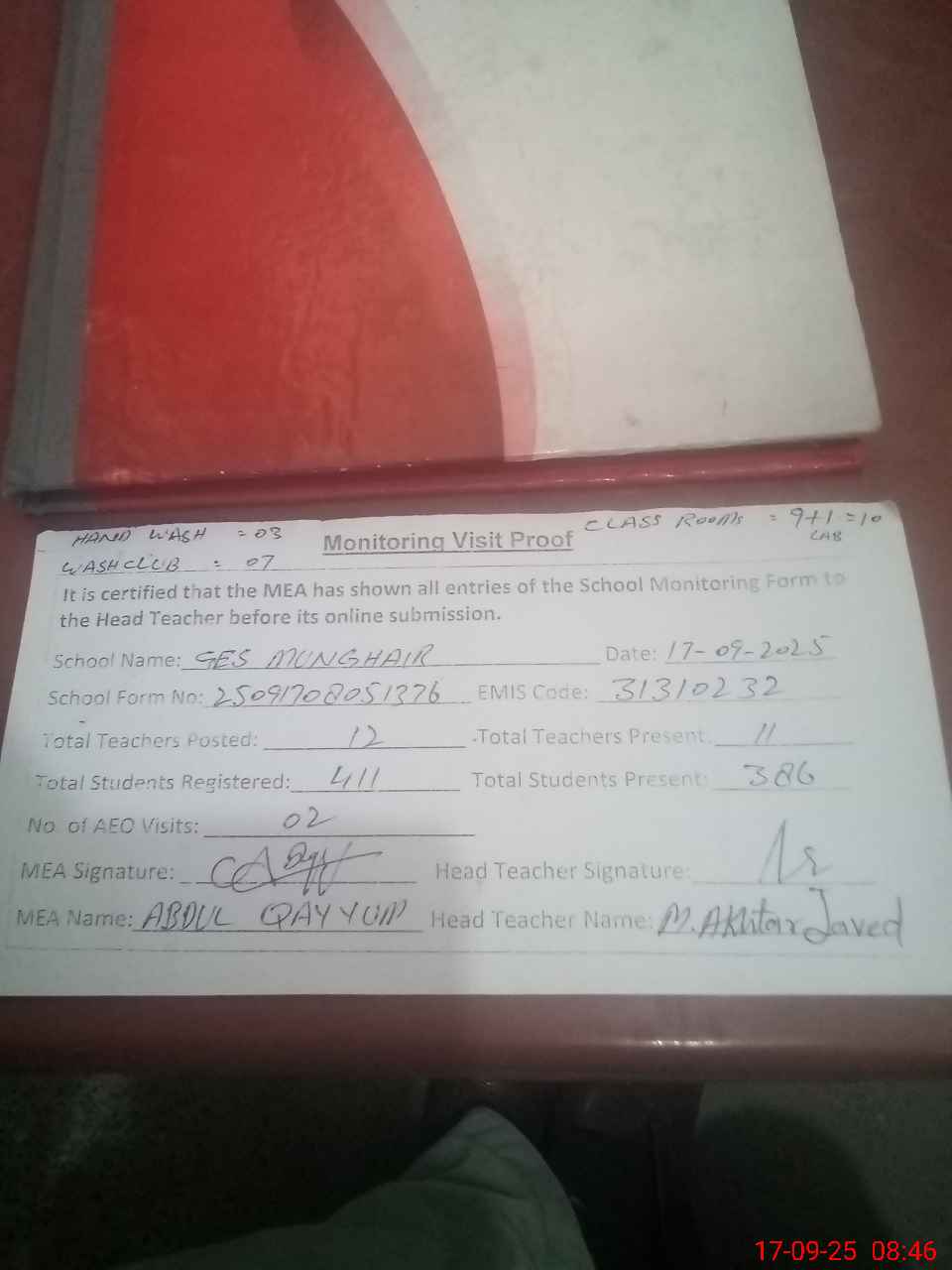 | Attendance Register | Head Teacher | MEA with School | Visit Proof |