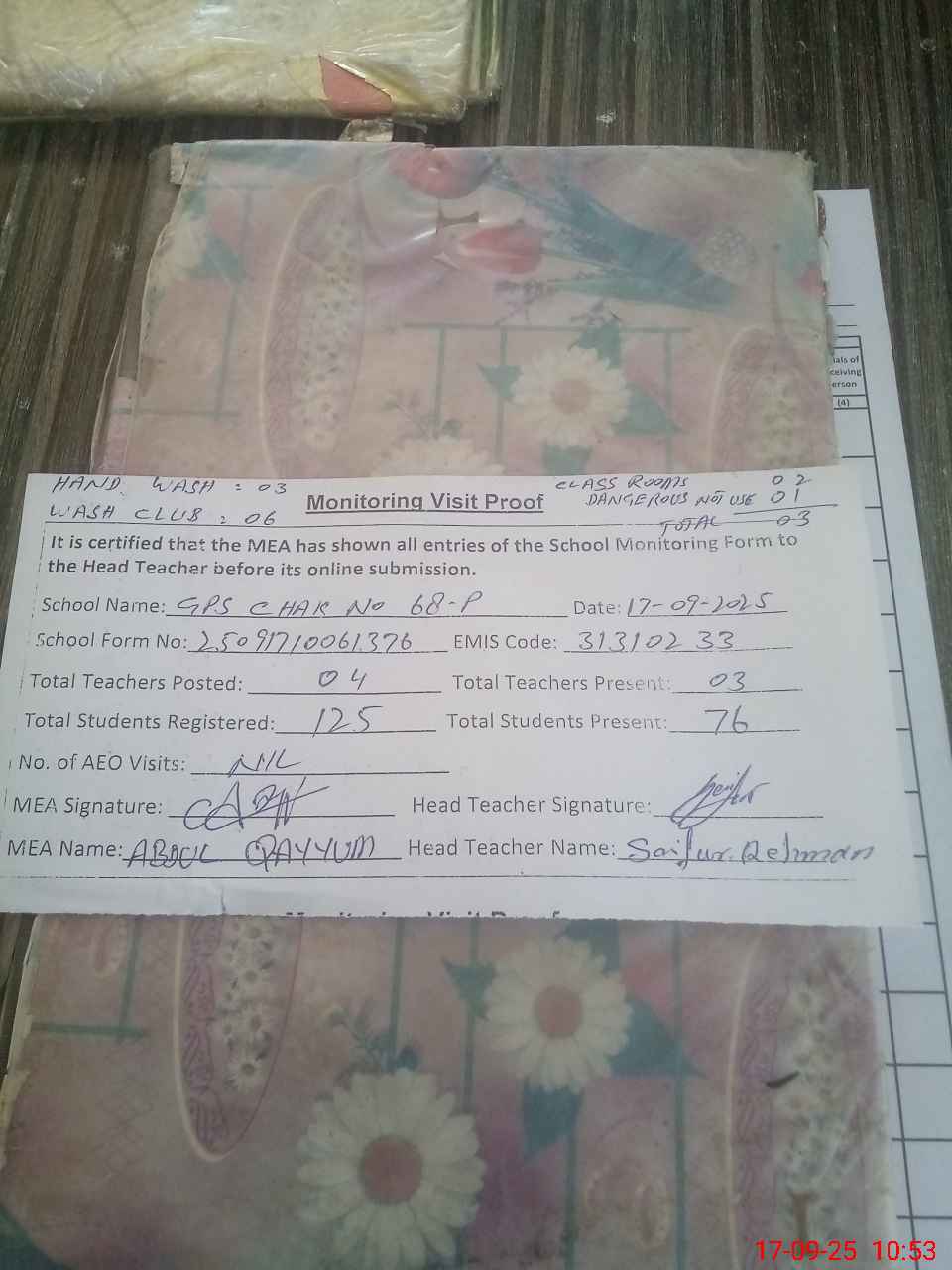| Attendance Register | Head Teacher | MEA with School | Visit Proof |