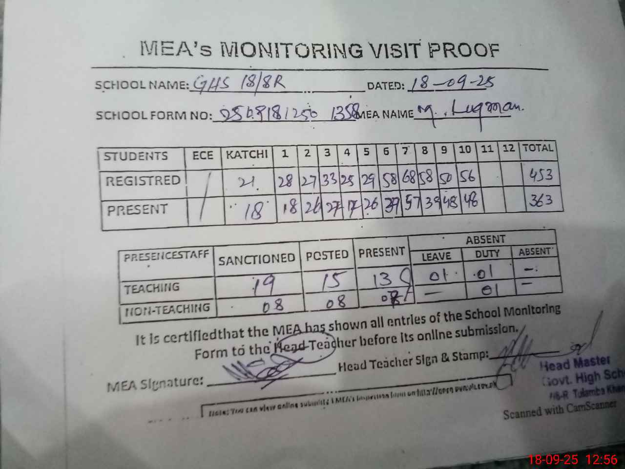 | Attendance Register | Head Teacher | MEA with School | Visit Proof |