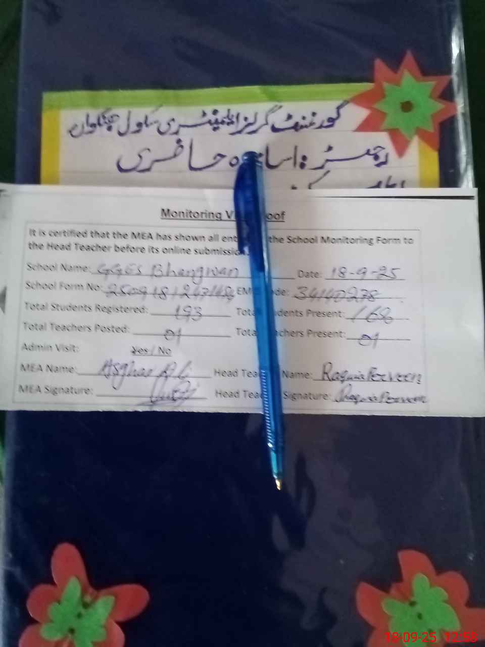 | Attendance Register | Head Teacher | MEA with School | Visit Proof |