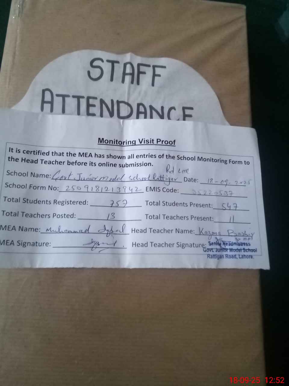 | Attendance Register | Head Teacher | MEA with School | Visit Proof |