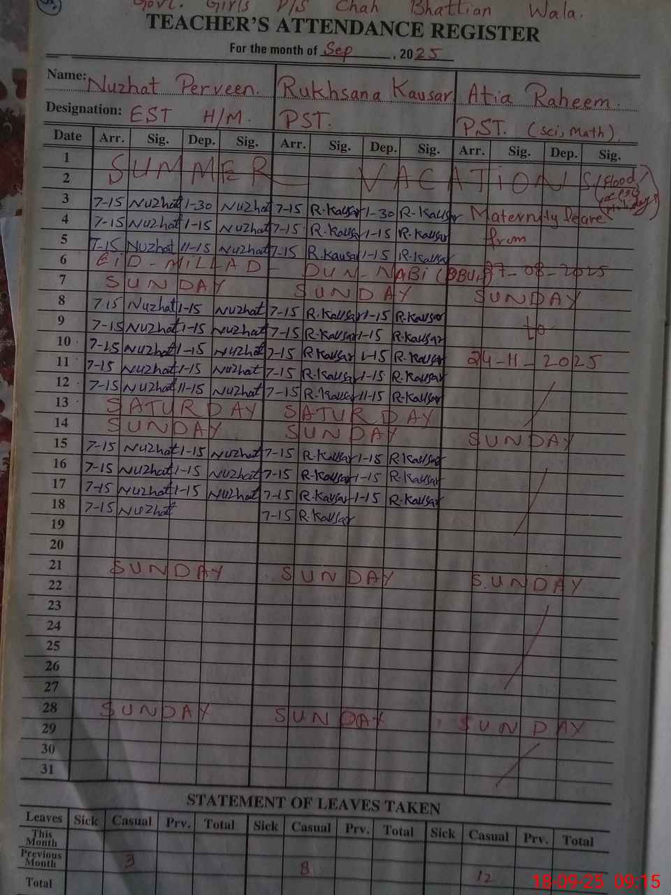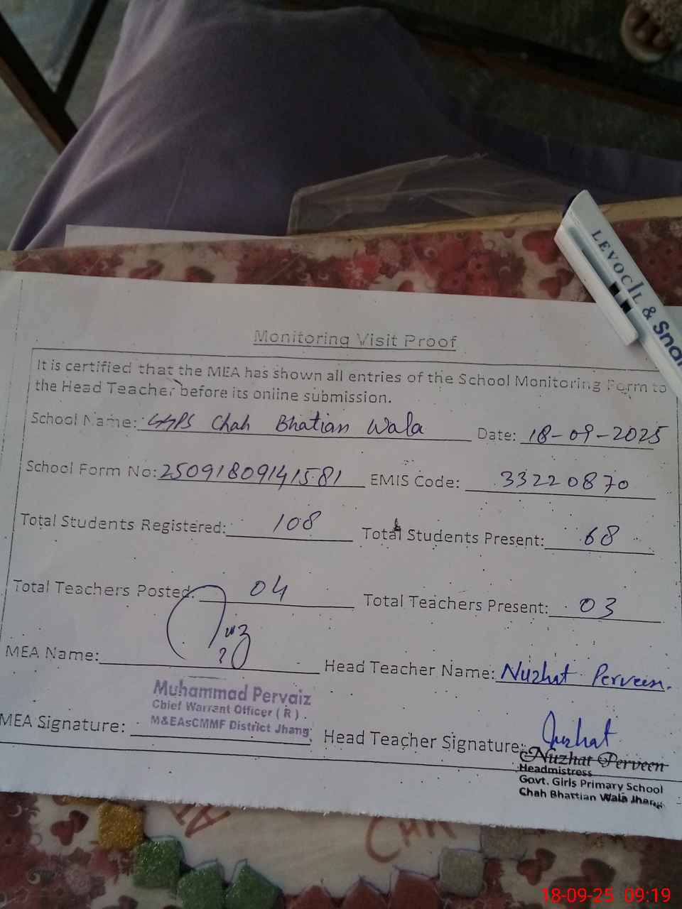 | Attendance Register | Head Teacher | MEA with School | Visit Proof |