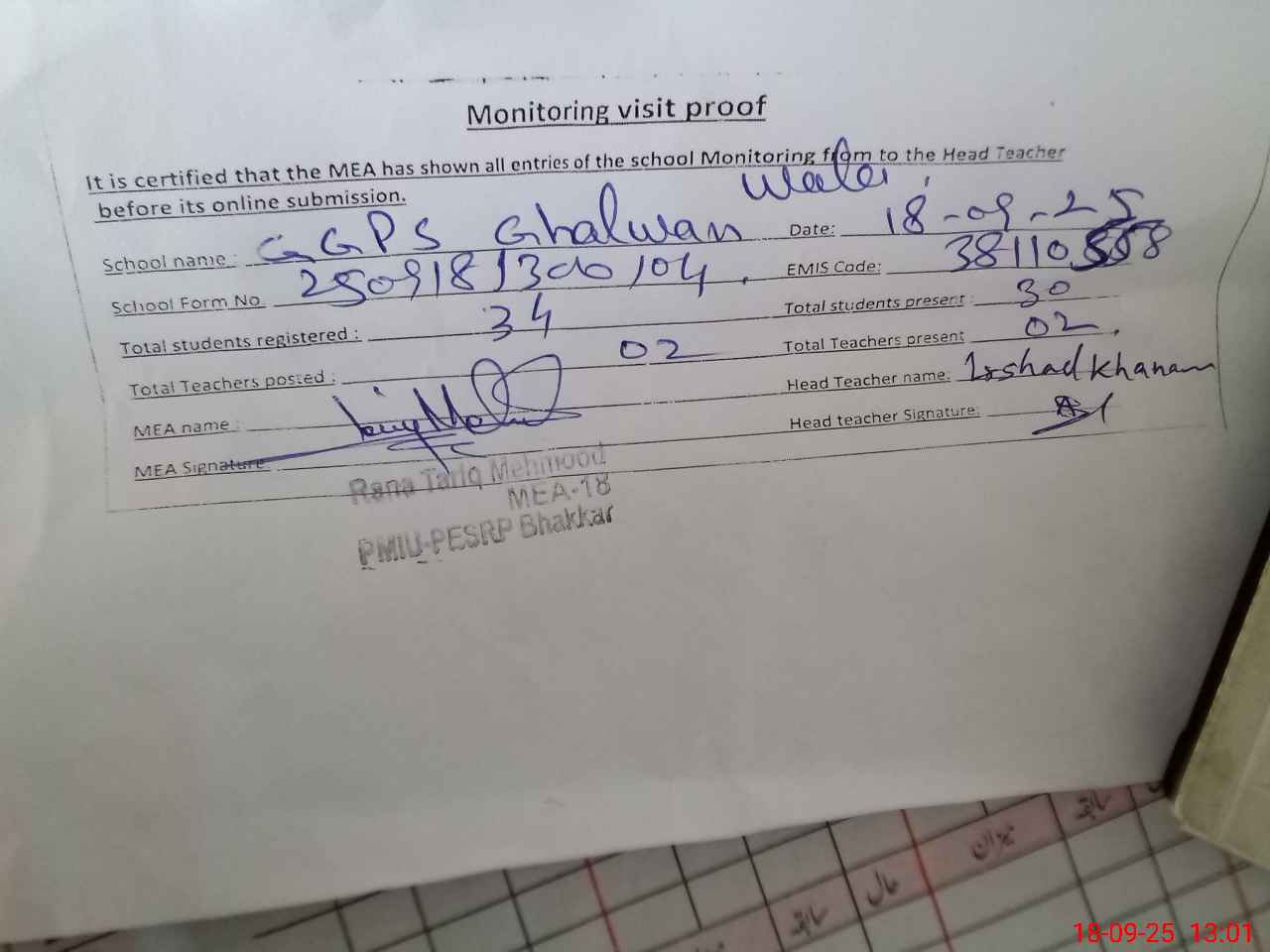 | Attendance Register | Head Teacher | MEA with School | Visit Proof |
