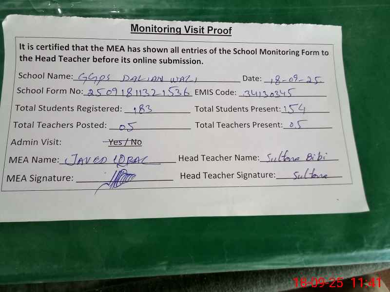 | Attendance Register | Head Teacher | MEA with School | Visit Proof |