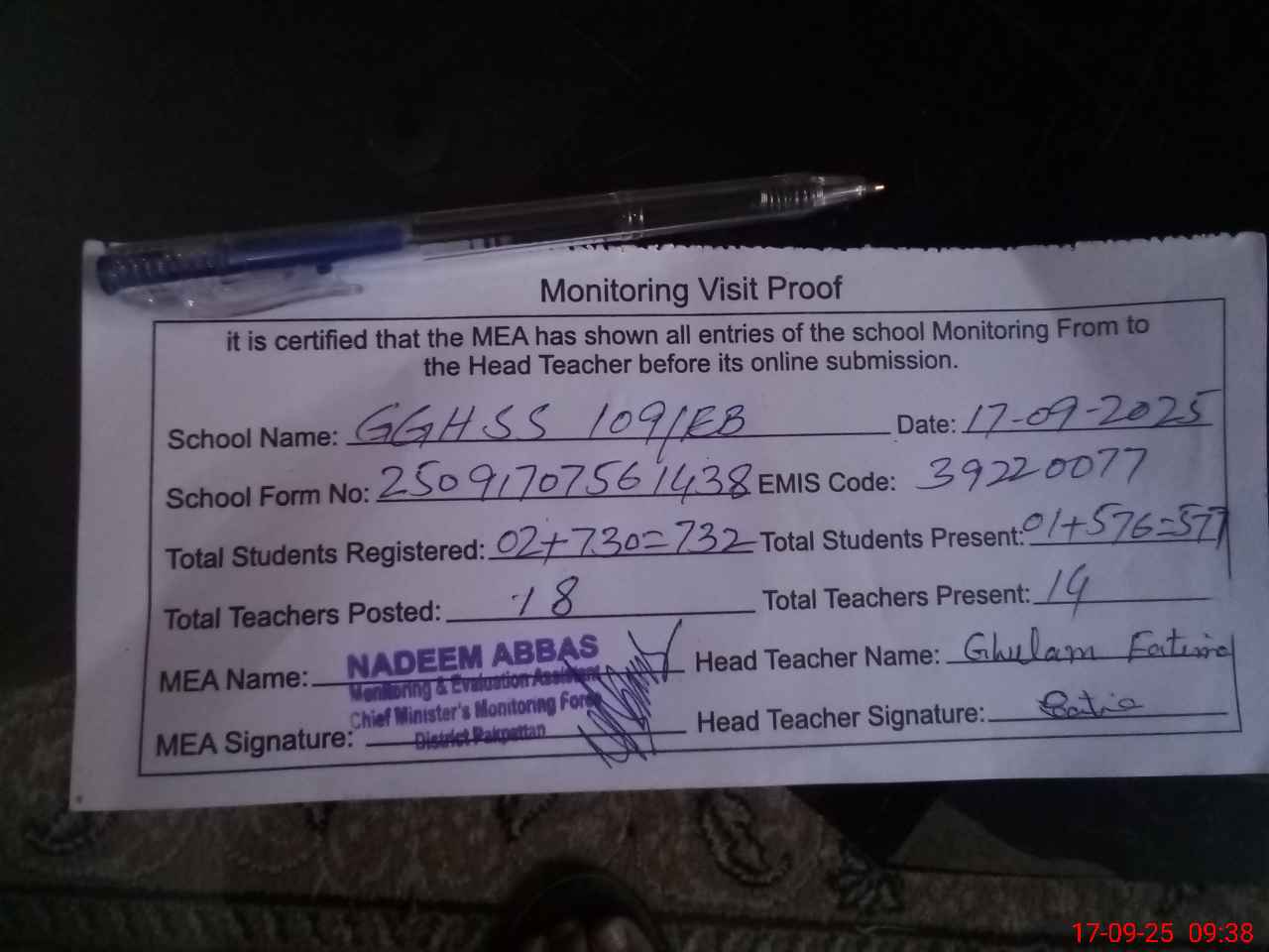 | Monitoring Date: 17-09-2025 | Start Time: 17-09-2025 07:56 AM | End Time: 17-09-2025 09:39 AM | Name of MEA: NA**** AB**** | |