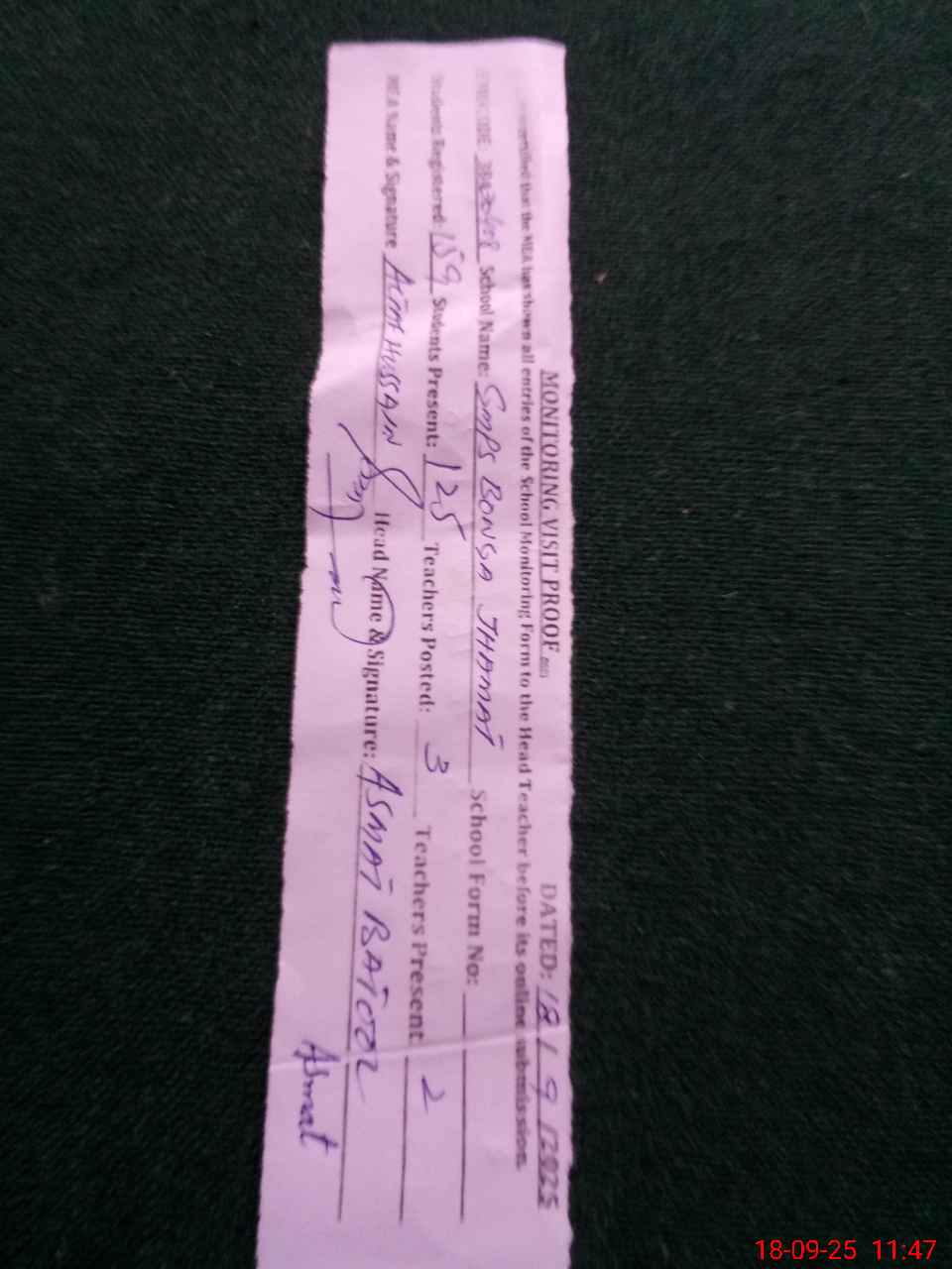 | Attendance Register | Head Teacher | MEA with School | Visit Proof |