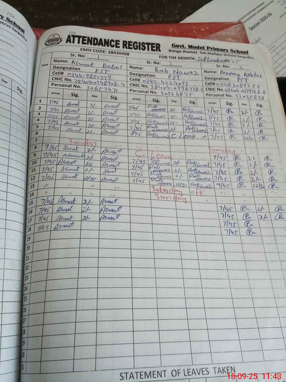 | CNIC | Full Name | Designation | R/C | Absence during last cal. month |