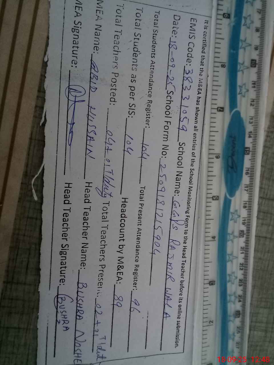 | Attendance Register | Head Teacher | MEA with School | Visit Proof |