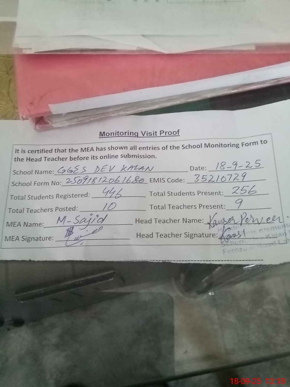 | Attendance Register | Head Teacher | MEA with School | Visit Proof |