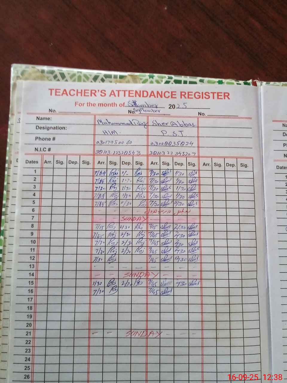 | CNIC | Full Name | Designation | R/C | Absence during last cal. month |