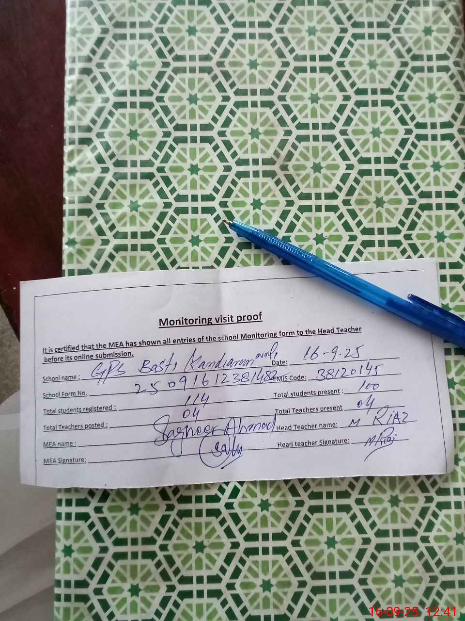 | Attendance Register | Head Teacher | MEA with School | Visit Proof |