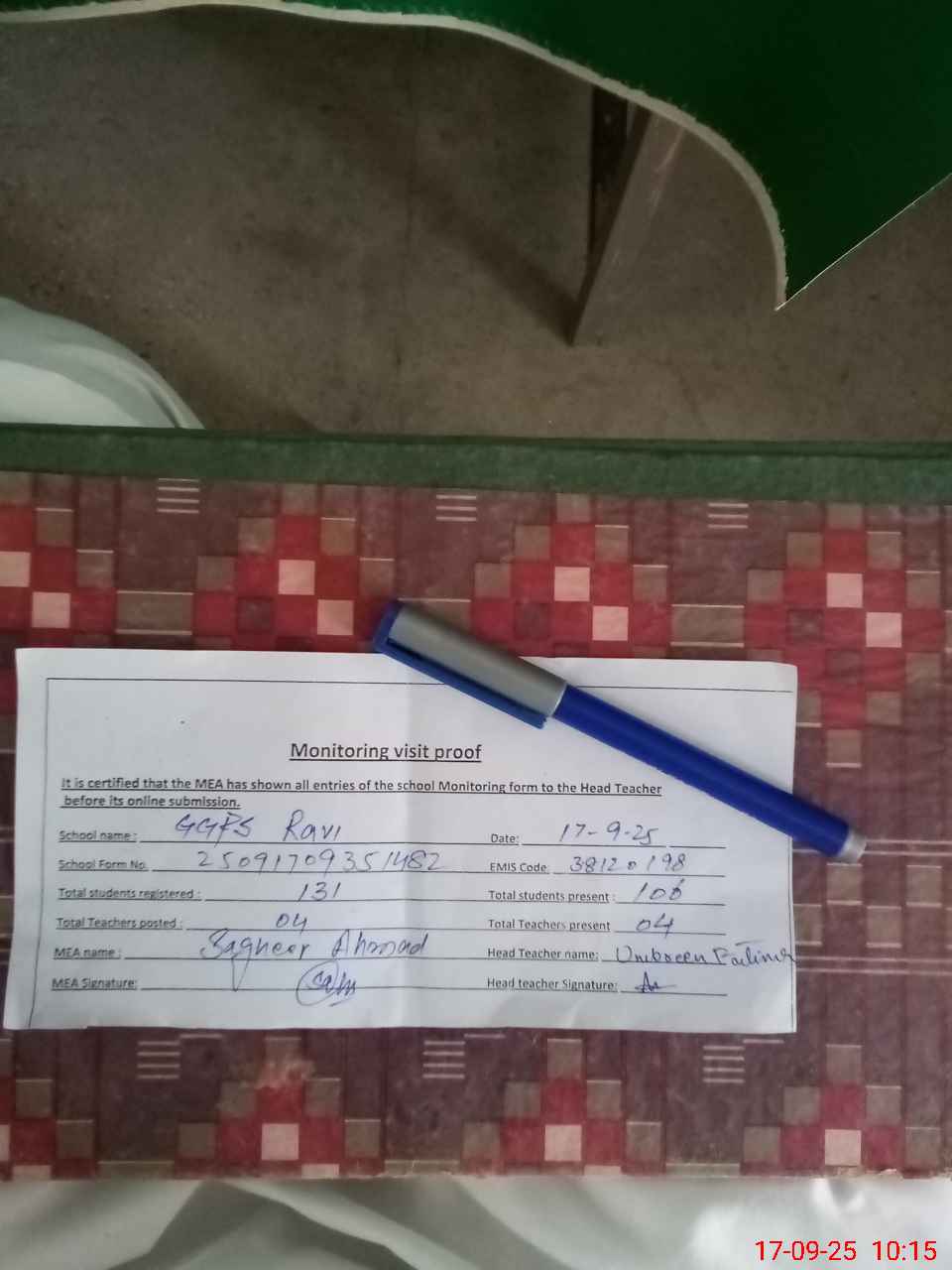 | Attendance Register | Head Teacher | MEA with School | Visit Proof |