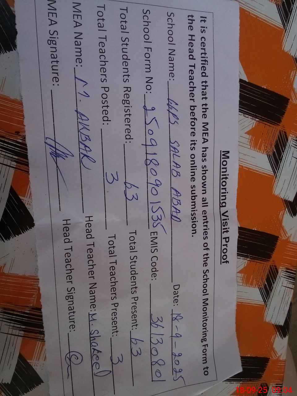 | Attendance Register | Head Teacher | MEA with School | Visit Proof |