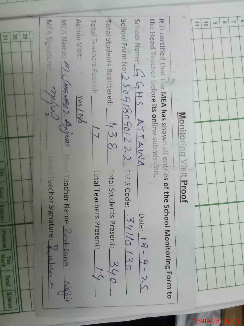 | Attendance Register | Head Teacher | MEA with School | Visit Proof |