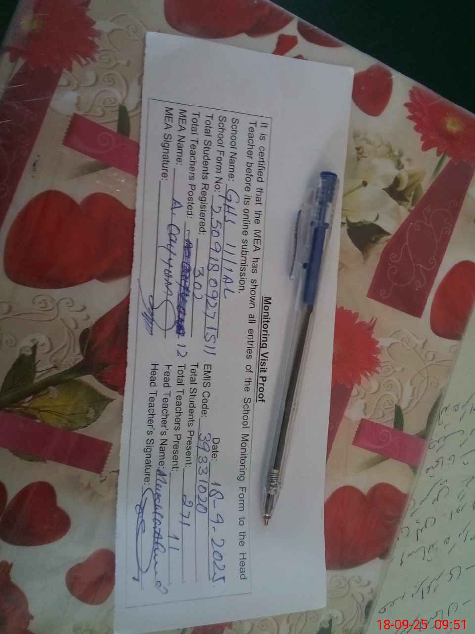 | Attendance Register | Head Teacher | MEA with School | Visit Proof |