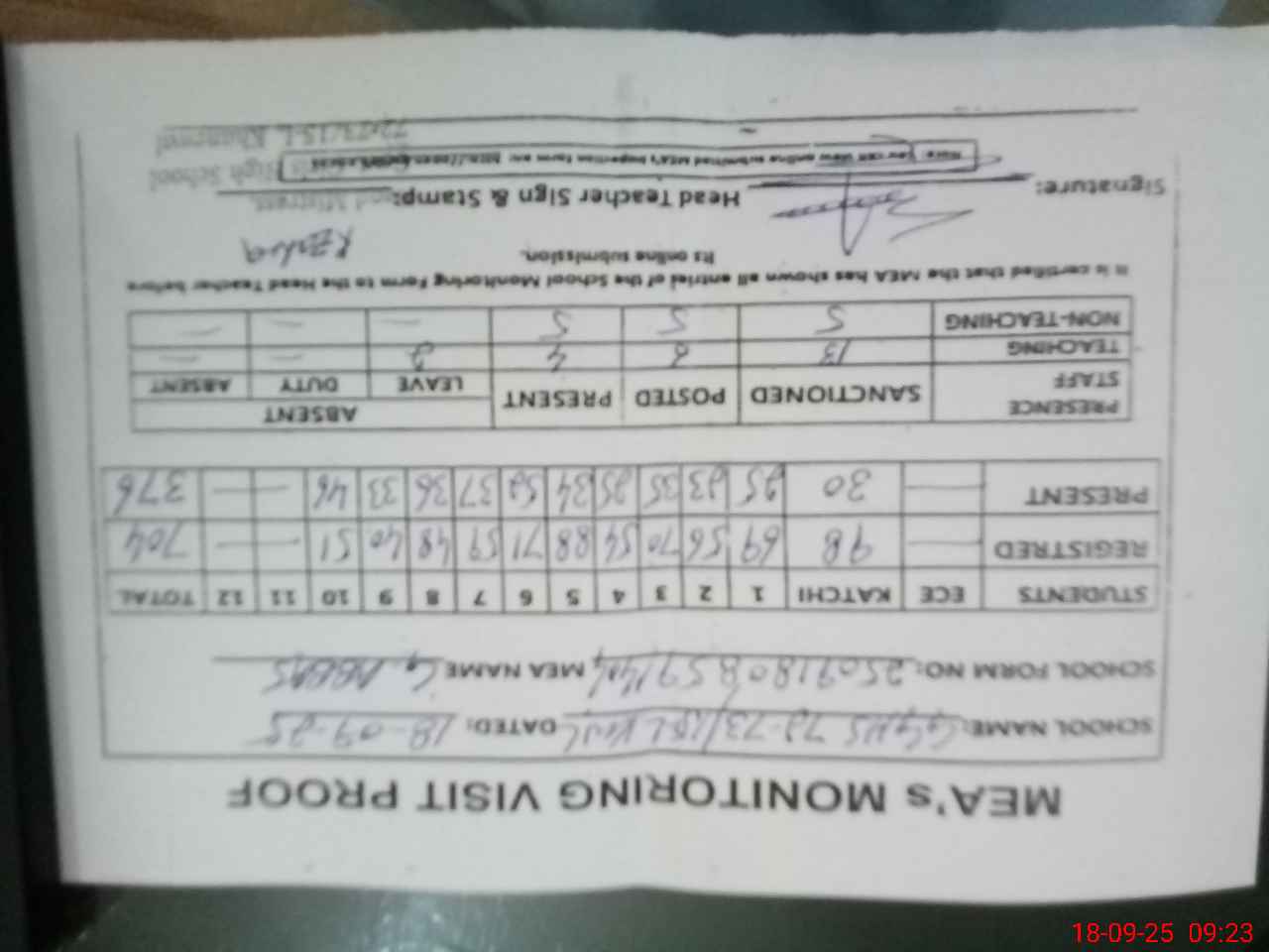| Attendance Register | Head Teacher | MEA with School | Visit Proof |