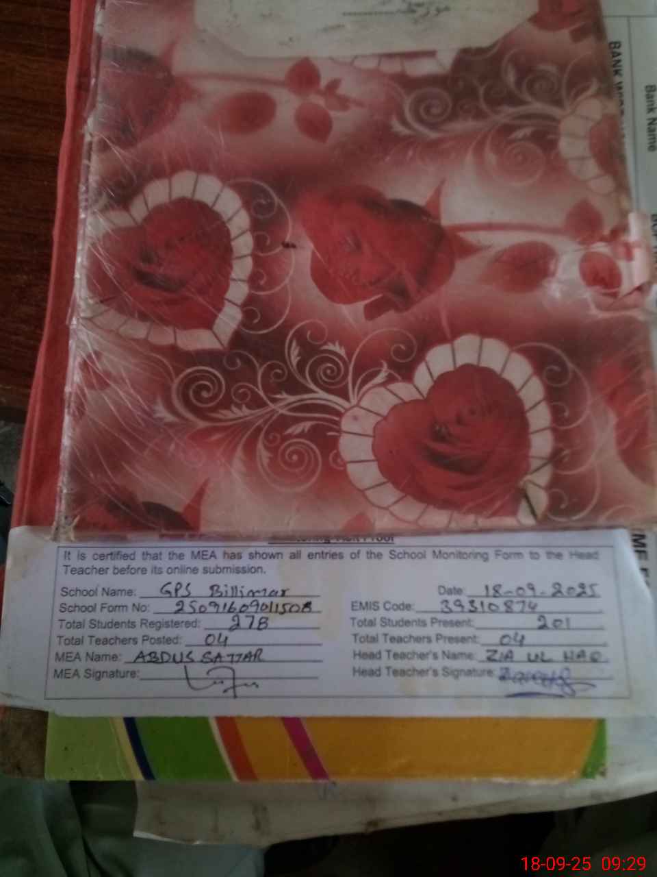 | Attendance Register | Head Teacher | MEA with School | Visit Proof |