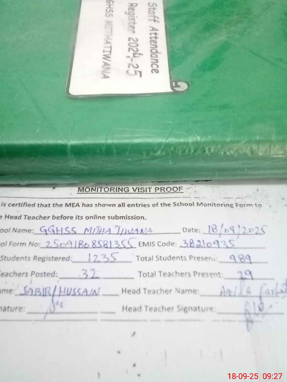 | Attendance Register | Head Teacher | MEA with School | Visit Proof |