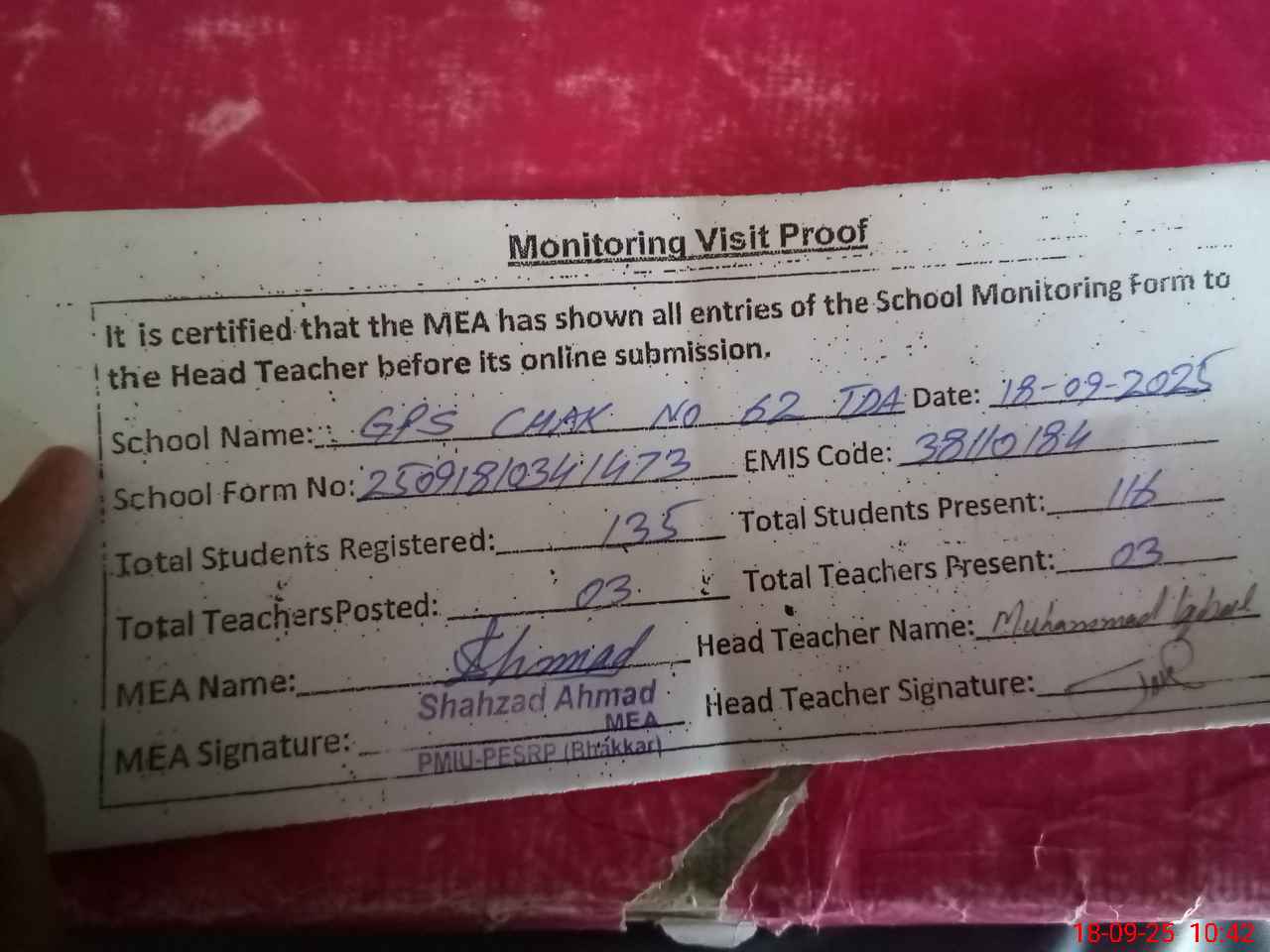 | Attendance Register | Head Teacher | MEA with School | Visit Proof |