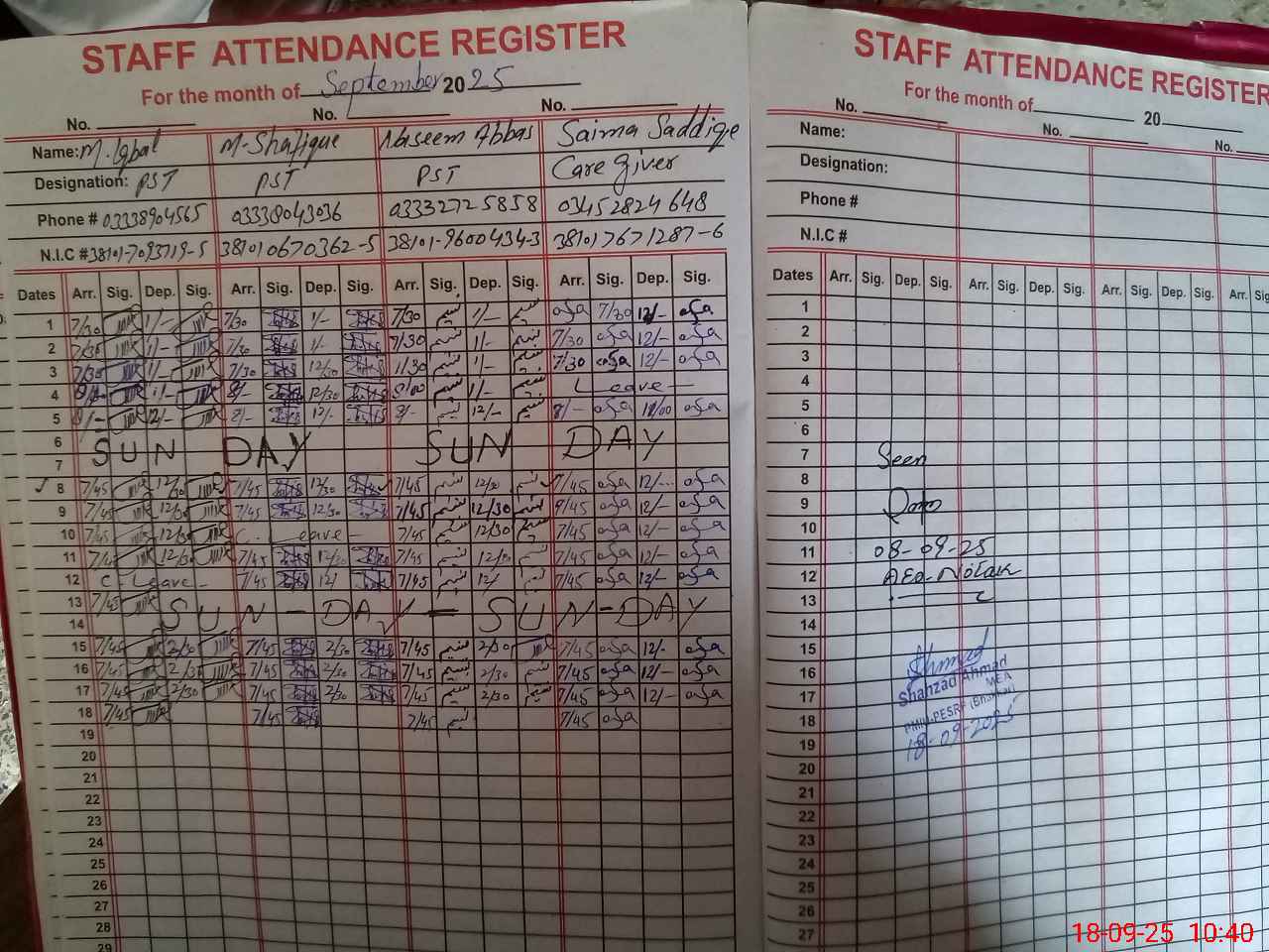 | CNIC | Full Name | Designation | R/C | Absence During Last Calender Month |