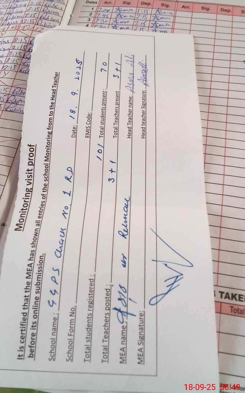 | Attendance Register | Head Teacher | MEA with School | Visit Proof |