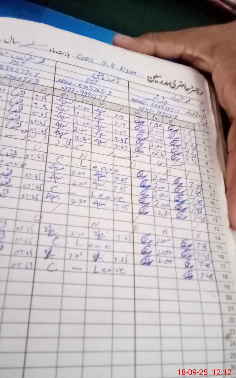 | CNIC | Full Name | Designation | R/C | Absence During Last Calender Month |