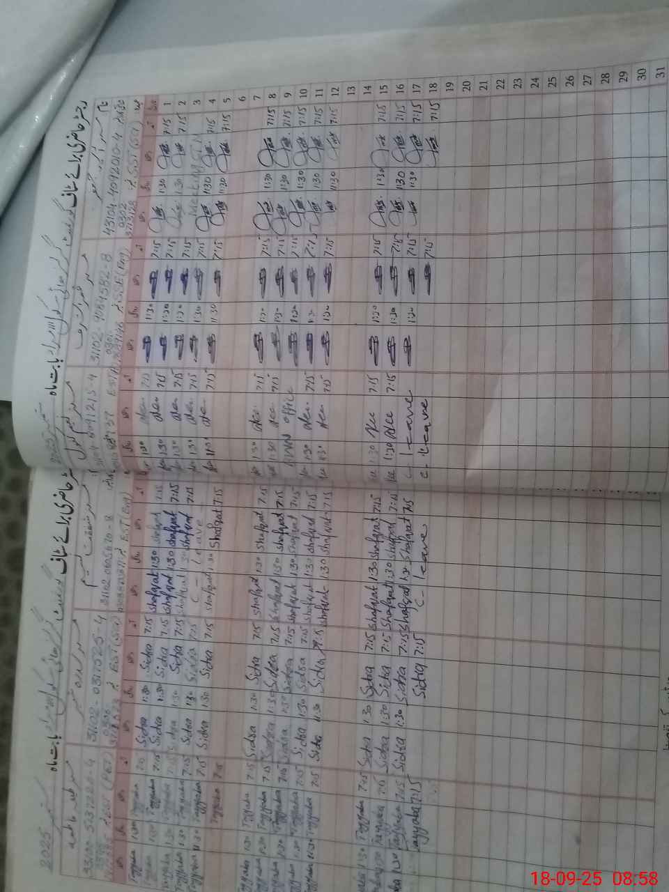 | CNIC | Full Name | Designation | R/C | Absence during last cal. month |