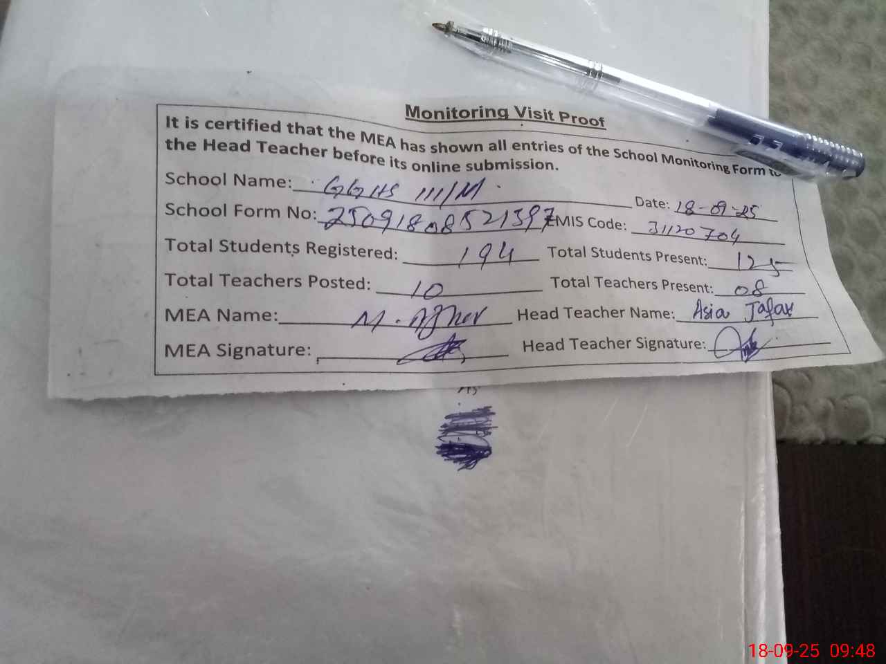 | Attendance Register | Head Teacher | MEA with School | Visit Proof |