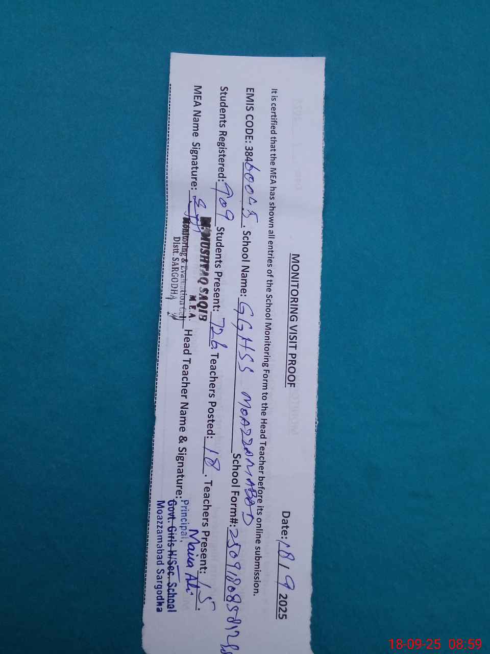 | Name: AF**** ZA**** Designation: (School Headmaster's/Headmistress's) PRINCIPAL Phone/Cell Number: 03**** |