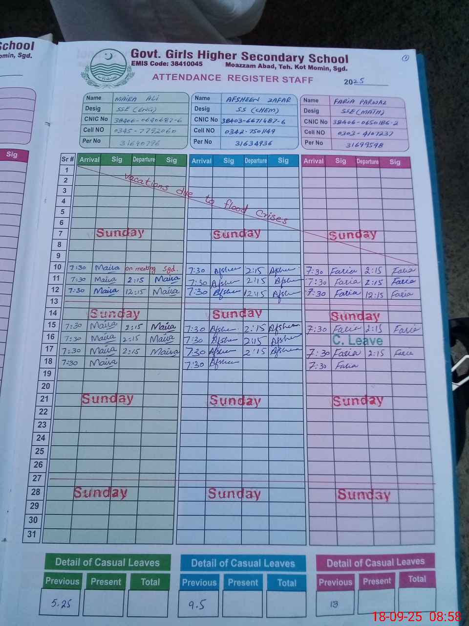 | CNIC | Full Name | Designation | R/C | Absence during last cal. month |
