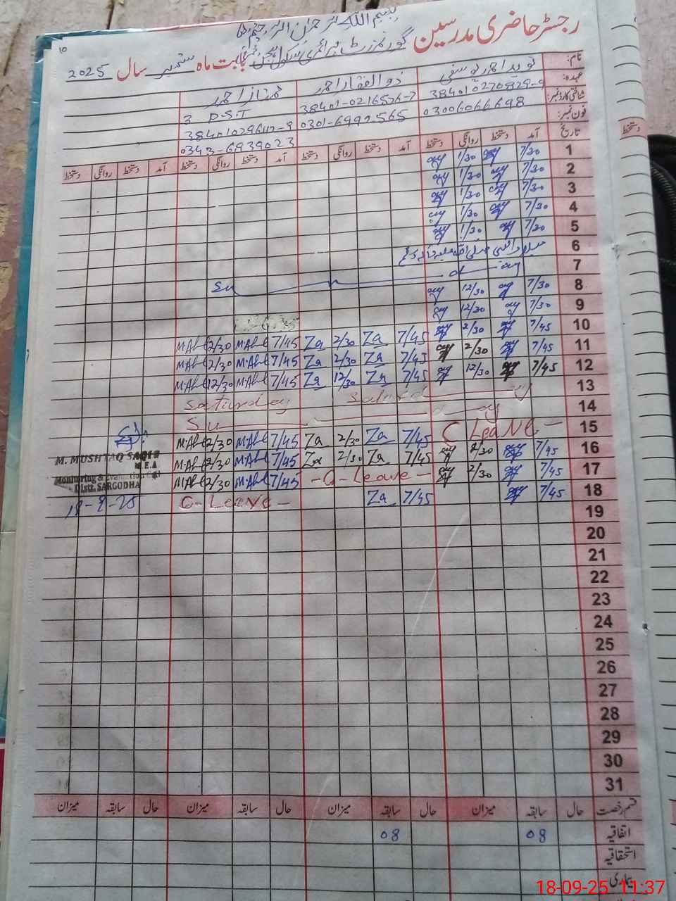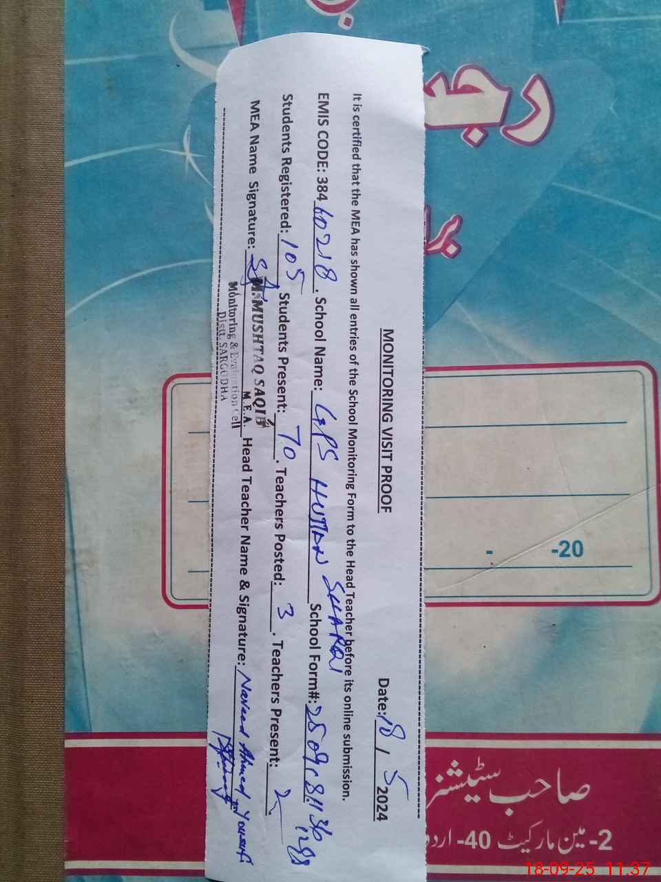 | Attendance Register | Head Teacher | MEA with School | Visit Proof |