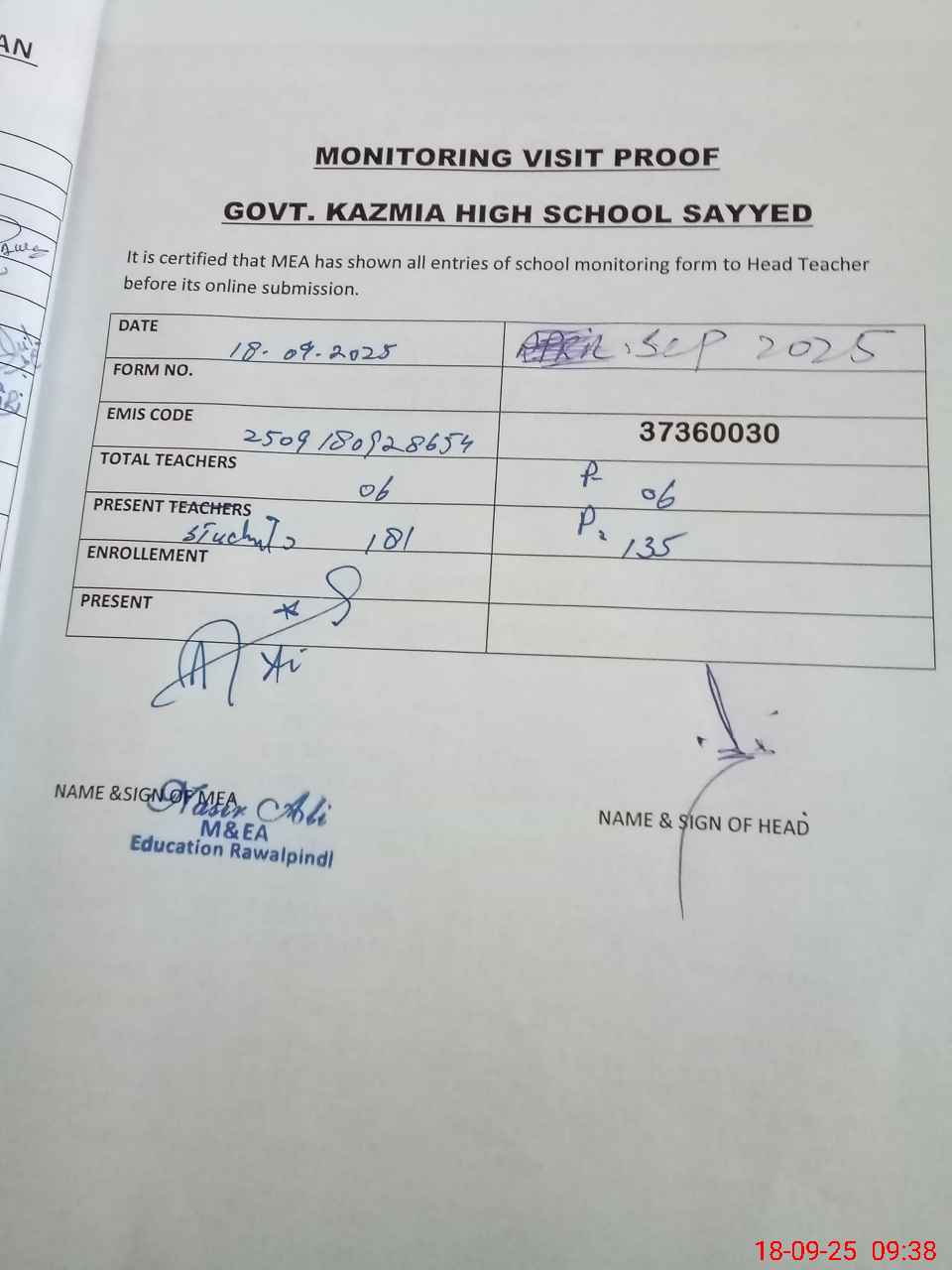 | Attendance Register | Head Teacher | MEA with School | Visit Proof |