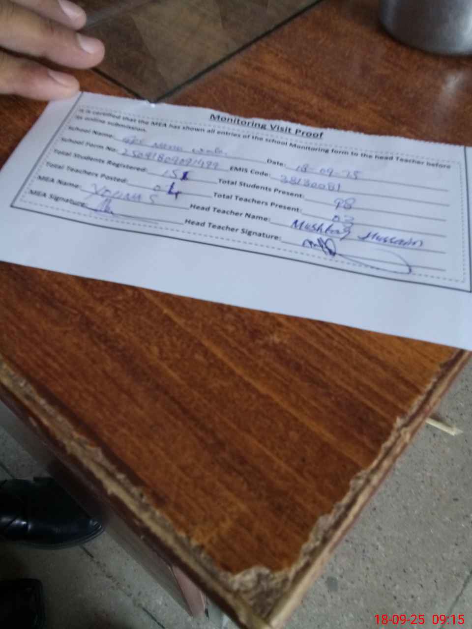 | Attendance Register | Head Teacher | MEA with School | Visit Proof |