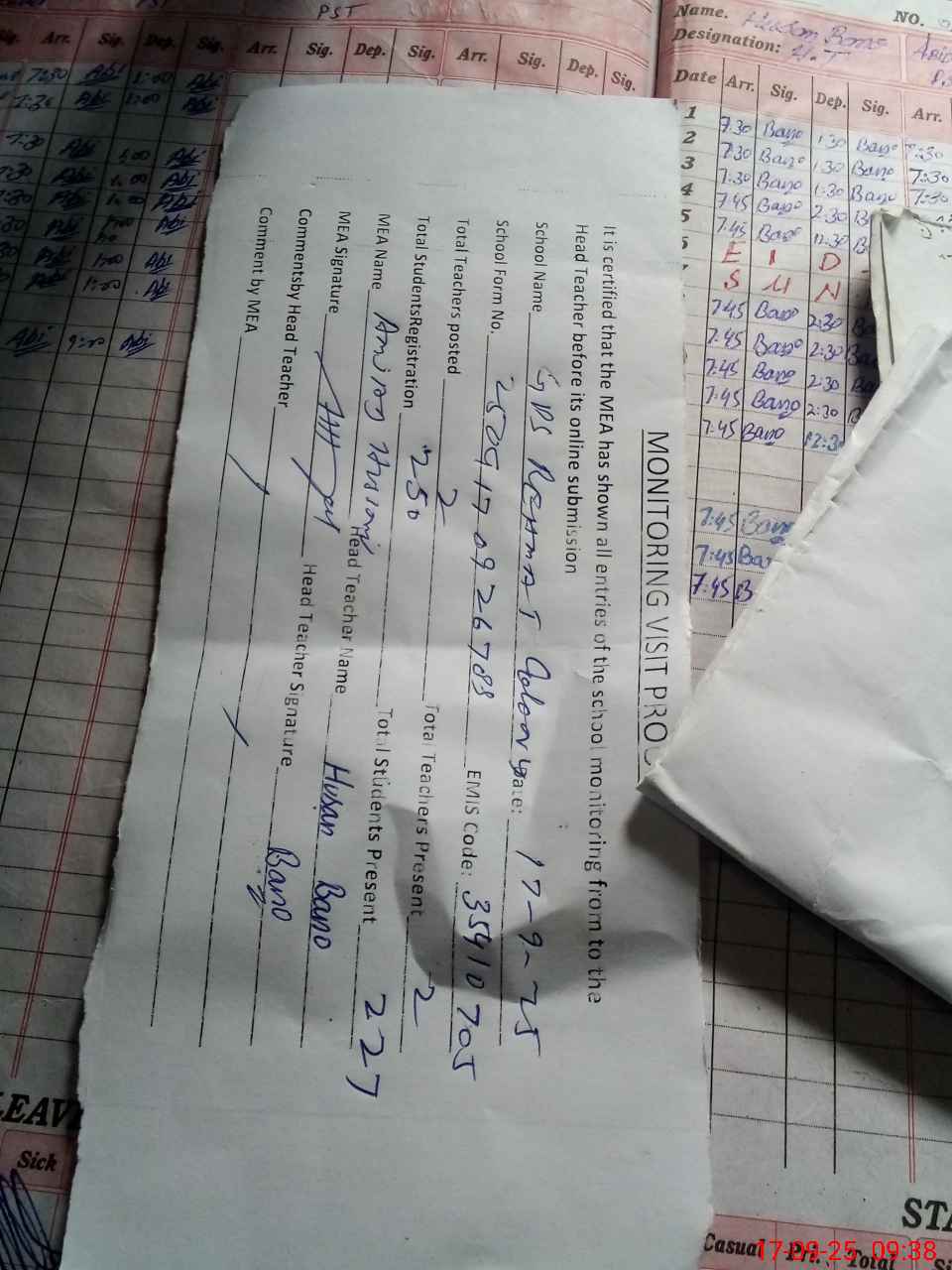 | Attendance Register | Head Teacher | MEA with School | Visit Proof |