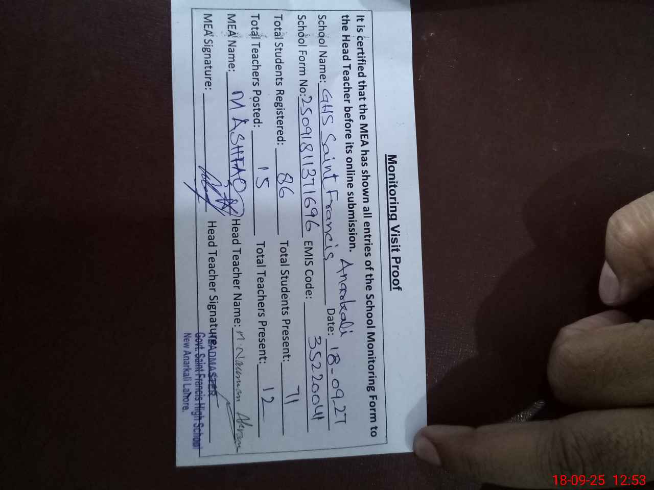 | Remarks (Use Separate Page if Required): School Head Master Muhammad Younis and EST Wajahat Ali according to attendance register both on casual leave but not shown on SIS so mark them absent today School has total 30 rooms while 20 rooms declared dangerous and not in use and maintinance work under process in 01 room Lab Whole school building looking poor condition 35220041 | |||||