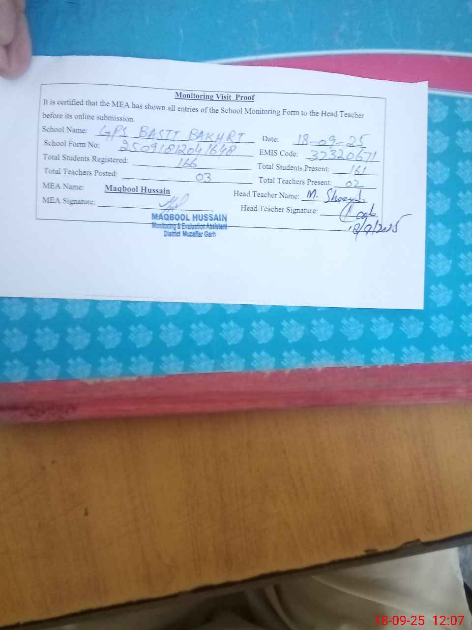 | Attendance Register | Head Teacher | MEA with School | Visit Proof |